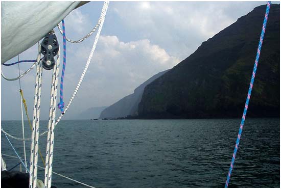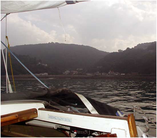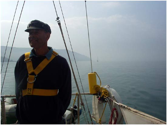 Three day cruise - Weston to Ilfracombe. Thurs 13th Sept Woody bay - and one of the few other boats we saw all day. Ian wearing his harness in flat calm to prove to his wife he's really safe sailing with me !