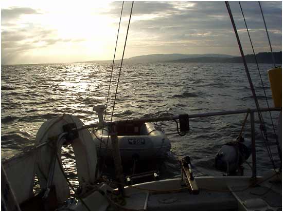Still pretty lively in the bay - even at Slack. Time to go - so set out into deeper water for home at 2.30.The wind was now in the NW - which was perfect - the tide would be right on our tail at up to 4 kts - so I set just the jib, part furled. We were getting 3.5 kts, without any tide as we set out. Didn't want to be in Weston too early - couldn't get up the Axe until about 18.50. Still towing the dingy . Wonder what handicap one would get in local races - 'dingy in tow '. So the last leg - back to Weston Bay. I had done this twice before from around here singlehanded - but not from Blue Anchor. Just held a visual line to Steep Holm . managed to miss DZ3 buoy ( where did that come from ). I was used to coming up form much further out offshore. Steep seas still running out past DZ3 - a good 2.5m swell, breaking on the crests coming from the NW. Settled a bit by the time we reached Steep Holm. Weston bay still lively - but not in comparison to S of Culver sands. The strong winds directly against a spring tide must have kicked it all up some in the morning - and it was taking a while to settle now. I was quite happy with it - and was on the helm all the way into Weston.. She seems fine in these sorts of seas, We could have put the main up for a bit more lateral stability, but we would have been way early on Weston -and killing time there, waiting for the depth to get in the Axe. continues to - A setting sun, Weston Bay, Axe approach, home. |